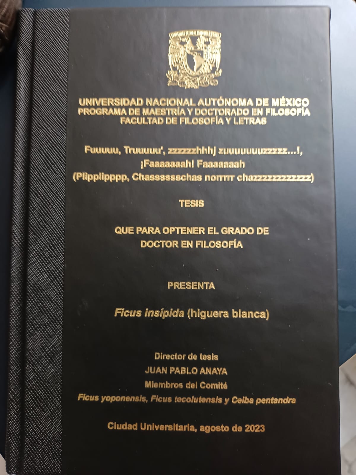 Fue un honor el que Ficus insipida (higuera blanca) me eligiera como su director de tesis. Estoy feliz de que un comité con tanta experiencia haya decidido aprobarla por unanimidad. ¡Enhorabuena!