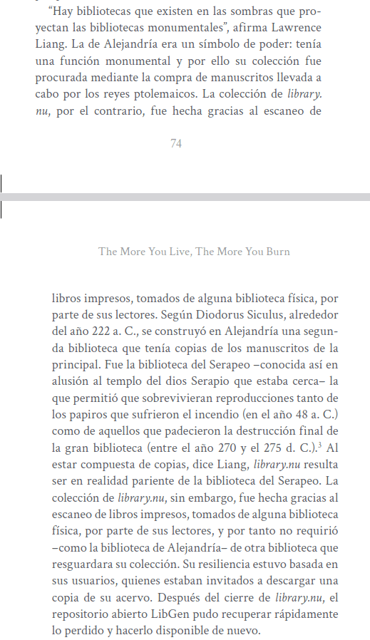 Creo que la mejor traducción de “shadow library” es “biblioteca sombra”. Las shadow libraries no están solo en las sombras de la vigilancia que ejerce el DMCA (Digitial Millenium Copyright Act), sino que también son la sombra (el doble o la copia) de los acervos que están en las bibliotecas monumentales (o en grandes librerías). Aquí en este fragmento de mi ensayo “The More you Live, the More you burn” explico por qué ese término, que nos ayuda a describir a la extinta library.nu, conviene también para otras como library genesis, epublibre o pirateca.