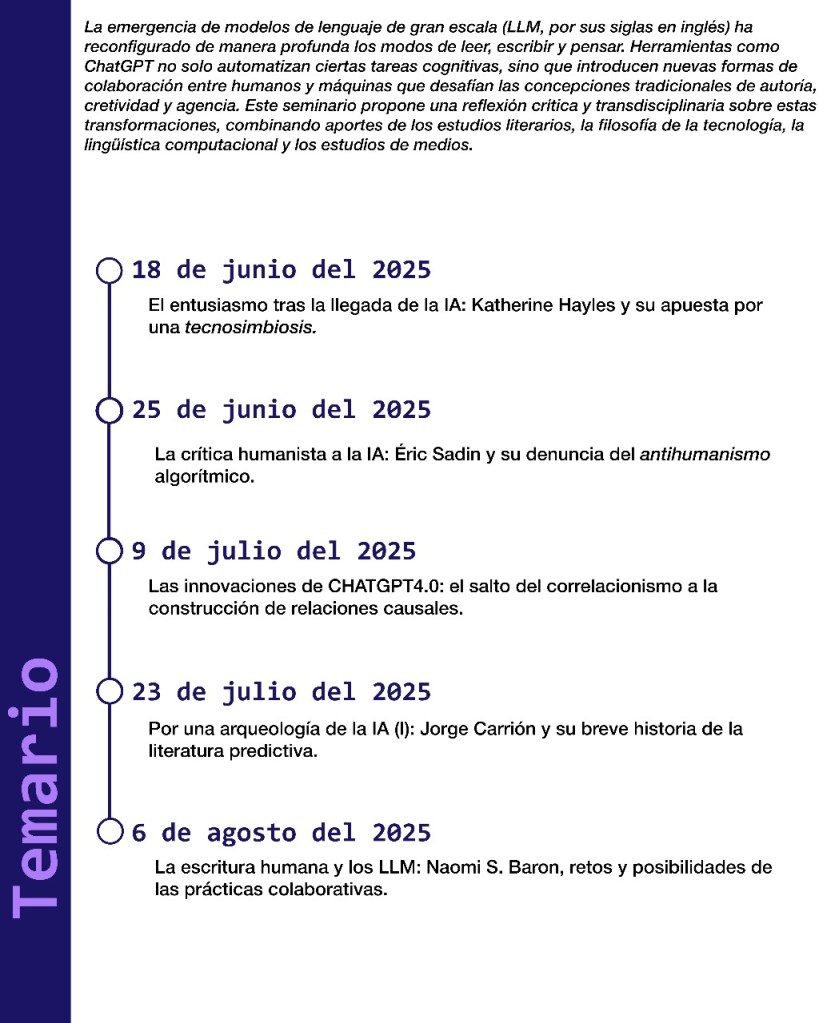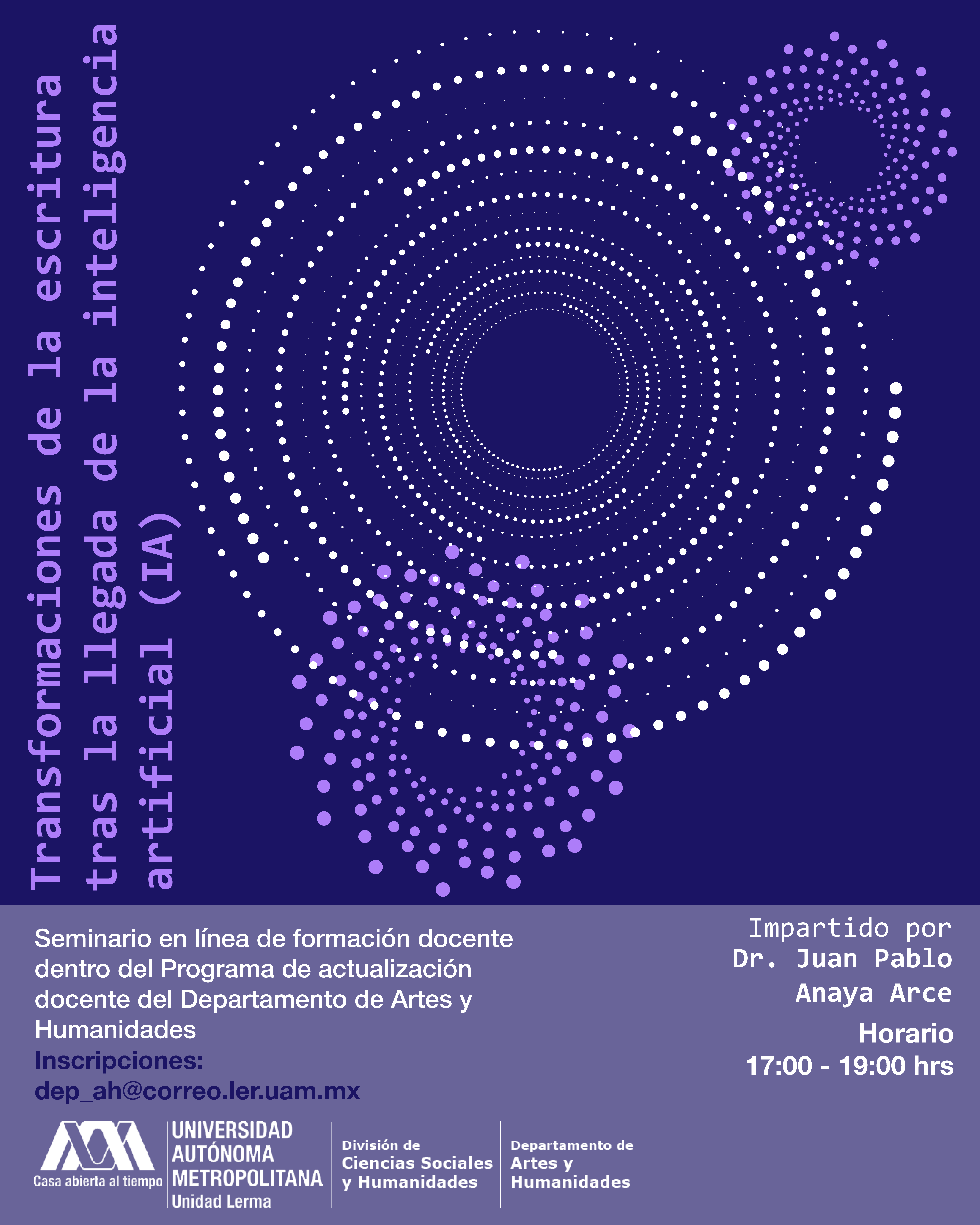 El próximo miércoles 18 de junio, de las 5 a las 7 pm, estudiaremos y discutiremos el artículo de Katherine Hayles titulado “No prohíbas la inteligencia artificial en tu clase de escritura, exige su uso” (2024). Es la primera sesión del seminario en línea, “Transformaciones de la escritura tras la llegada de la inteligencia artificial”, que estaré coordinando en la UAM-Lerma. En la primera parte de la sesión expondré una síntesis del artículo y luego habrá tiempo para discutir y charlar. Quien este interesado en asistir favor de escribir a este correo: dep_ah@correo.ler.uam.mx para que podamos enviarle la lectura y darle el link de acceso a zoom.